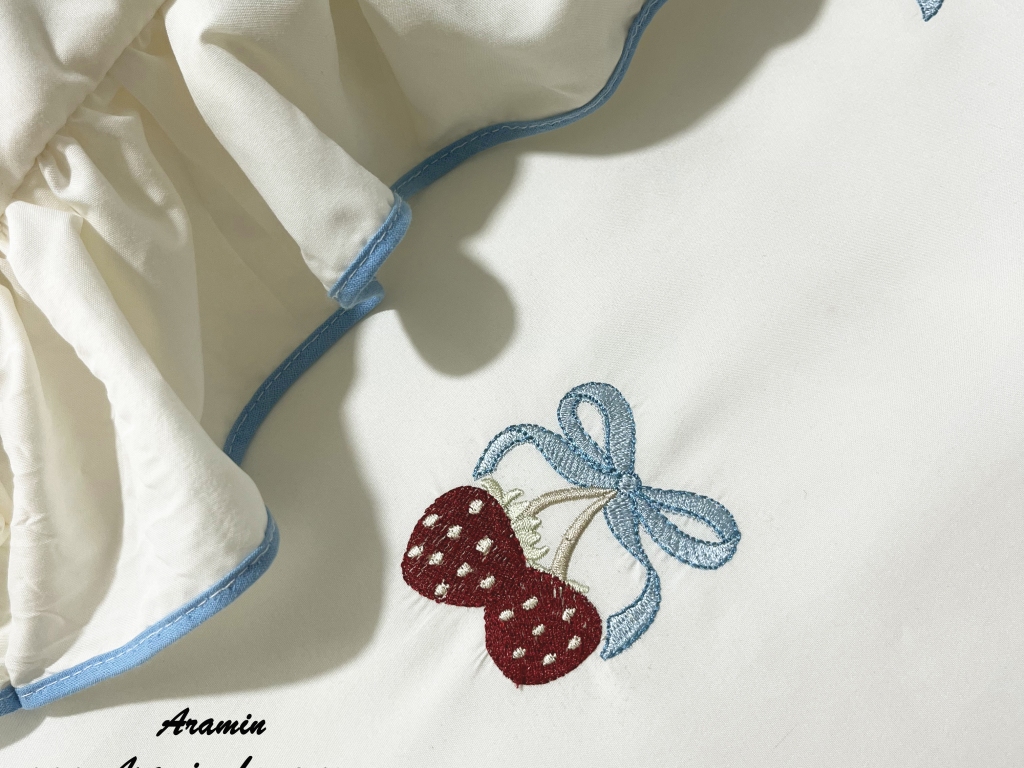این ست زیبا با گلدوزی‌ و مغزی‌دوزی ظریف طرح توتفرنگی و پاپیون ترند و دور چین دار، گزینه‌ای شاد و خاص برای دکوراسیون اتاق خواب است. طراحی چشم‌نواز و رنگ‌های ملایم آن، حس تازگی و طراوت را به فضای شما می‌بخشد.
