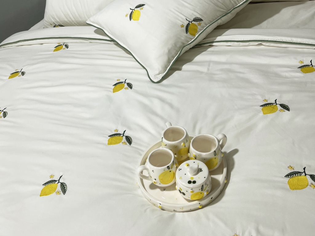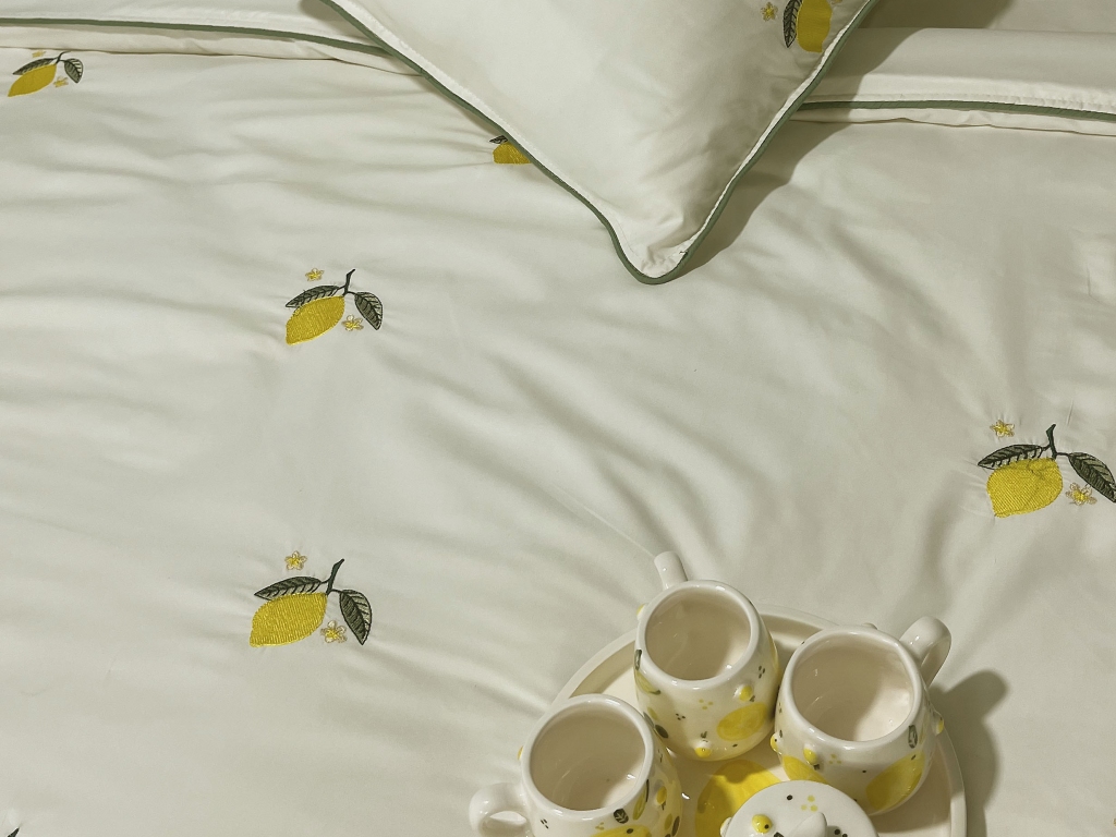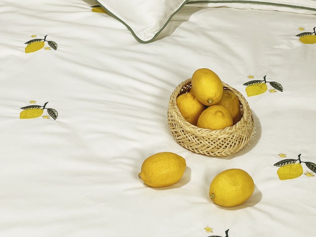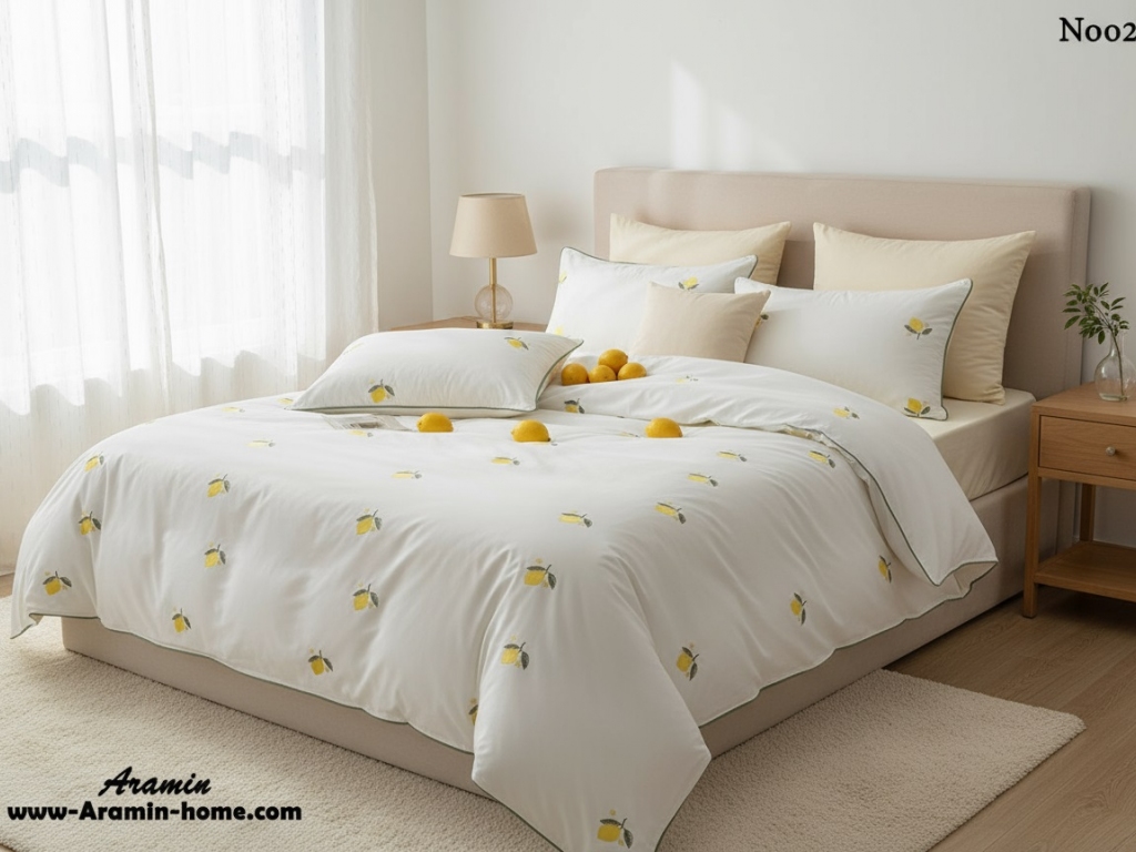 این ست زیبا با گلدوزی‌ و مغزی‌دوزی ظریف طرح لیمو، گزینه‌ای شاد و خاص برای دکوراسیون اتاق خواب است. طراحی چشم‌نواز و رنگ‌های ملایم آن، حس تازگی و طراوت را به فضای شما می‌بخشد.
