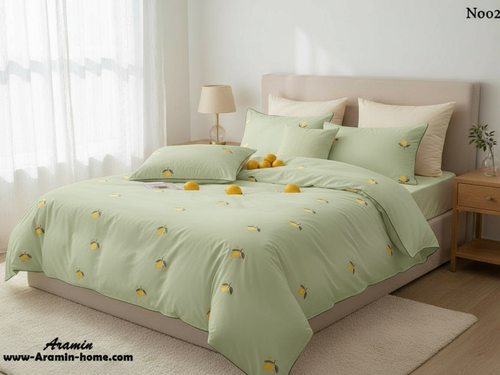این ست زیبا با گلدوزی‌ و مغزی‌دوزی ظریف طرح لیمو، گزینه‌ای شاد و خاص برای دکوراسیون اتاق خواب است. طراحی چشم‌نواز و رنگ‌های ملایم آن، حس تازگی و طراوت را به فضای شما می‌بخشد.