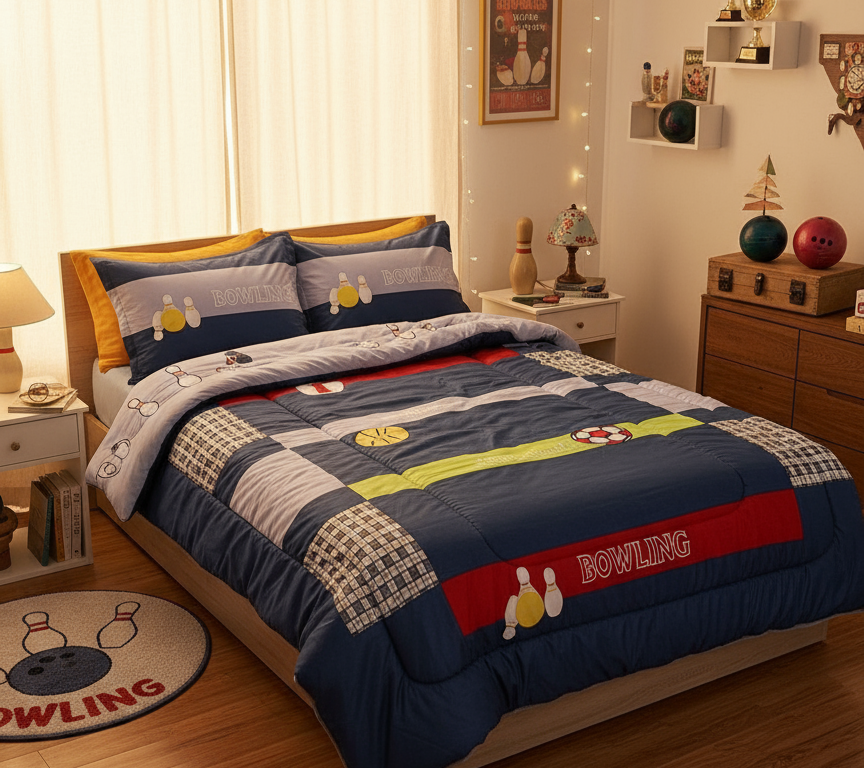 ست لحاف یکنفره سه تکه طرح توپ بولینگ تمام گلدوزی و تکه دوزی
